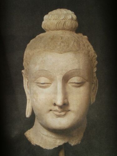 ガンダーラから出土した仏頭です。 なんという気品に満ちたお顔でしょうか。 漆喰の塑像だけに壊れやすいもので、頭部だけがこうして日本に伝わっています。 左の耳たぶが半分欠落していますが、お顔の気高さを損なうものではありません。 頭頂にある肉けい…