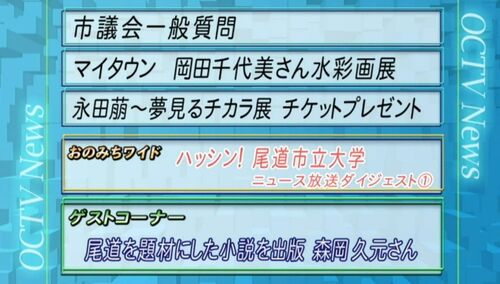 12月7日に尾道ケーブルテレビ(OCTV)のニュース番組の中にあるゲストコーナー に出演しました。生放送のDVDが送られてきました。 ここにUPできればいいのですが、DVDをソフト変換しないとUPできないということで、 わくわく亭にはできませ…