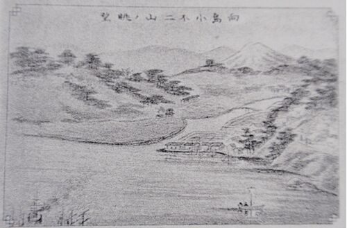 古い『尾道案内』に出てくる「向島小不二山ノ眺望」の絵図。 山は向島の高見山のことであるが、不二山(富士山)と呼んで観光案内したことがあるらしい。